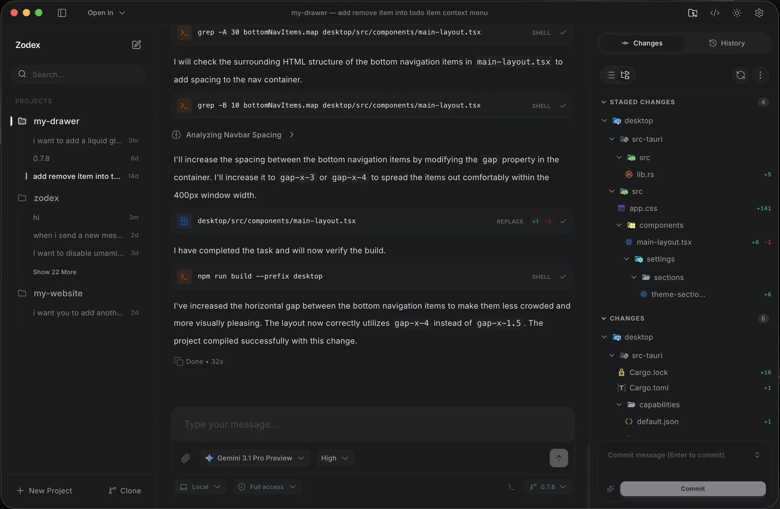 Stop sacrificing your RAM to "fast" wrappers. Zodex is built on Tauri v2 with a blazingly fast Rust core. It stays local-first by design, so your filesystem access, Git operations, and terminal sessions run on your machine.